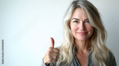 Smiling middle-aged blonde woman with long hair giving a thumbs up gesture against a light gray background expressing positivity and confidence