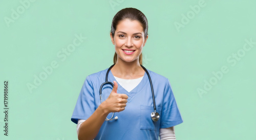 Smiling nurse giving a thumbs up with stethoscope around her neck.