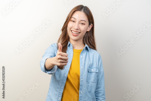 Smiling positive, cute asian young woman, girl hand showing thumb up, wearing casual, cheerful portrait of beautiful brunette hair, feeling happy looking at camera standing isolated on background.