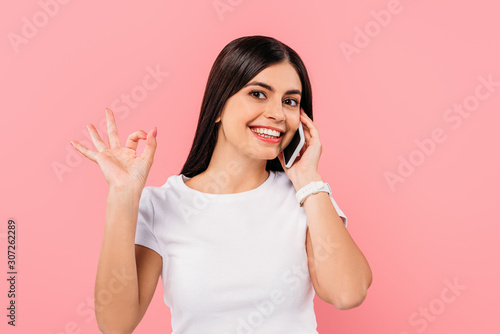 smiling pretty brunette girl talking on smartphone and showing ok isolated on pink