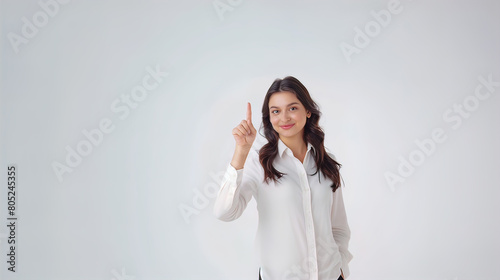 smiling pretty well-groomed young woman showing index finger up, isolated on white background, empty copy space
