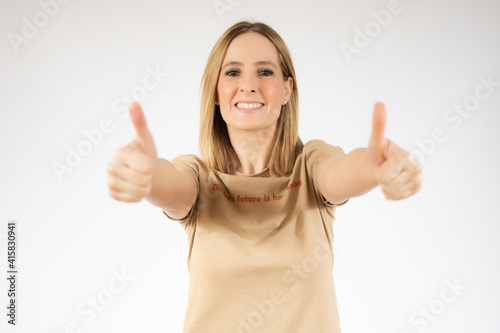Smiling pretty young woman in casual t-shirt showing thumbs up isolated over white background
