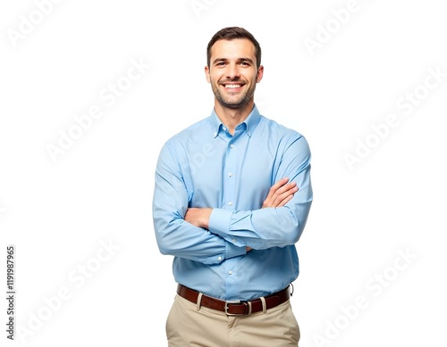 Smiling Professional Man Working on Laptop in Modern Office Setting