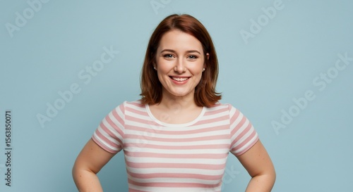 Smiling redhead woman portrait against a light blue background