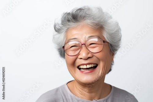 Smiling senior asian woman on white background. Topics related to old age. Asia. China. Japan. Retirement home. Grandmothers day . Retirement. Image for Graphic Designer. Senior residence. AI.