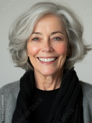 Smiling Senior Woman with Gray Hair Wearing a Scarf