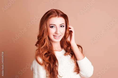 Smiling teen girl 16-18 year old wearing braces. Looking at camera. Teenager hood.