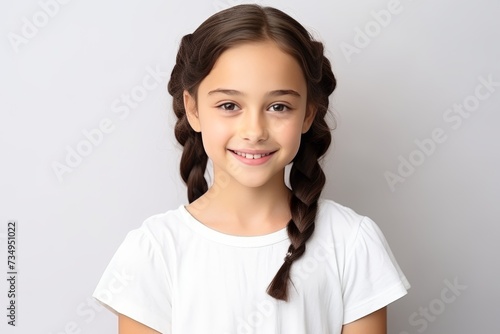 Smiling teen presenting white t-shirt for advertising on plain studio background
