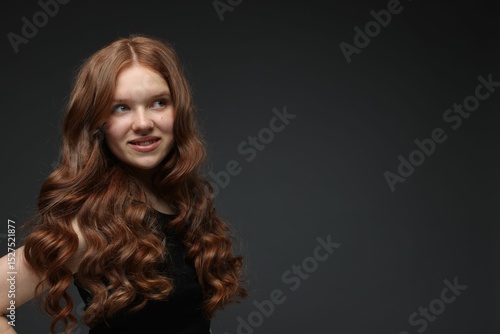 Smiling teenage girl with healthy wavy hair on dark grey background. Space for text