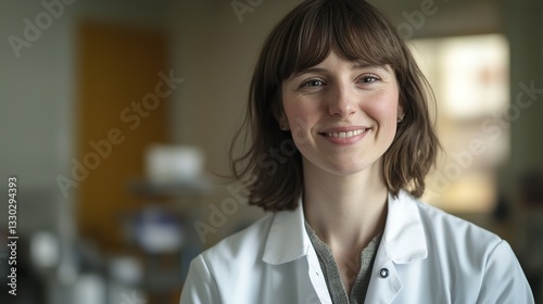 Smiling veterinarian in white coat, radiating warmth and professionalism, embodying compassionate care for animals.