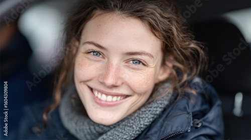 Smiling woman enjoys a cozy moment in a car during a chilly day