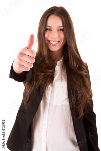 Smiling woman giving thumbs up