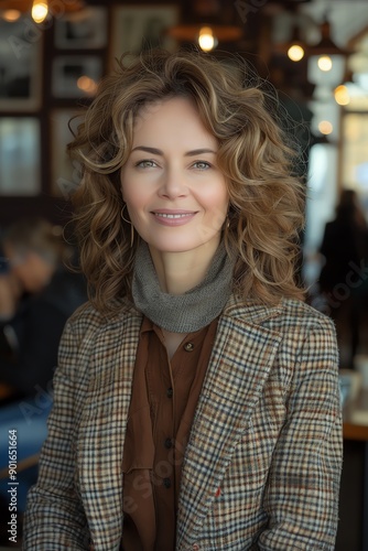 Smiling woman in a cafe, warm lighting, professional attire, friendly atmosphere