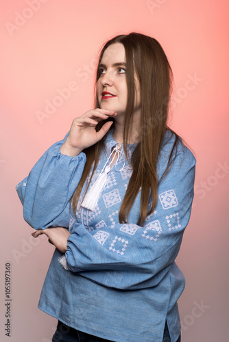 Smiling woman in a traditional Ukrainian blouse, isolated against a warm pink background. Emphasizes themes of cultural pride, ethnic fashion, and happiness.