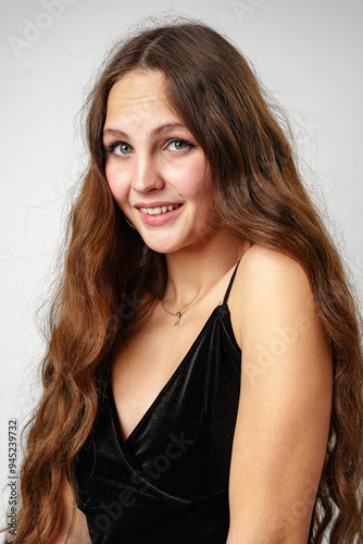 Smiling Woman In Black Top Against White Background