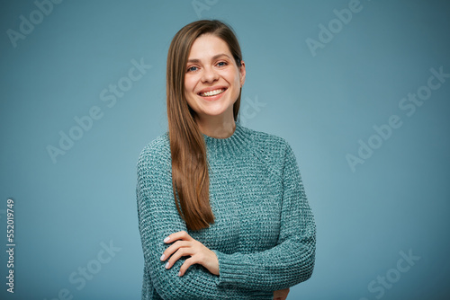 Smiling woman in casual blue clothes standing with arms crossed. Advertising female studio portrait on blue.