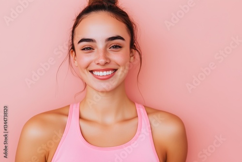 smiling woman in sport top and leggins, solid color background, neutral colors