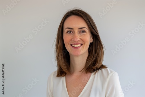 Smiling Woman in White Blouse. Generative AI.
