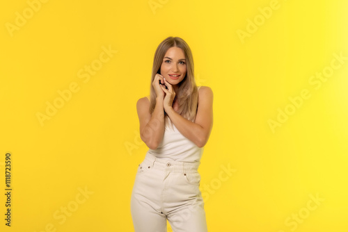 Smiling woman in white outfit poses playfully against a bright yellow backdrop in a studio setting during daytime