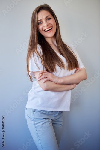 Smiling woman in white shirt portrait with crossed arms. Happy girl in white casual clothes.