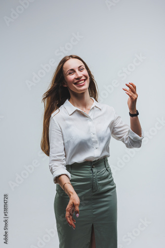 Smiling woman in white shirt recommends opt for advertising index finger to side on workspace, commercial promo area, copy space mockup isolated on white background