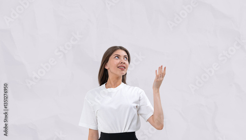 Smiling woman in white t-shirt looking up with raised hand.