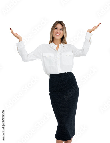 Smiling woman looking up with raised arms, isolated over white background