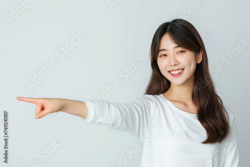 Smiling Woman Pointing to Side on White Background