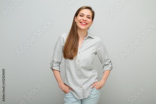 Smiling woman standing with hands in pockets, isolated female portrait, young lady dressed pants and gray shirt.