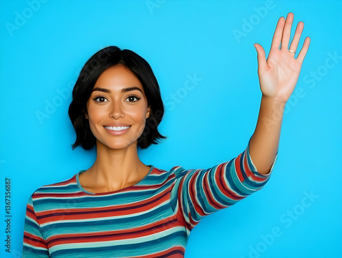 Smiling Woman Waving Hand Brunette Portrait Isolated On Blue Background Photo