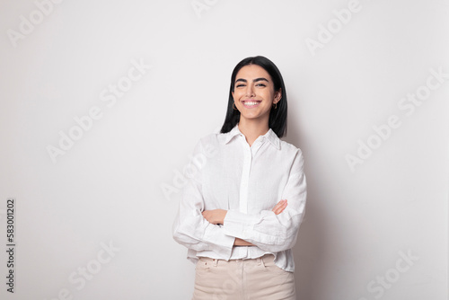 Smiling woman with arms crossed standing against white background