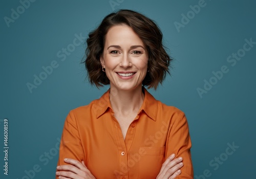 Smiling woman with arms crossed wearing an orange shirt against a blue background
