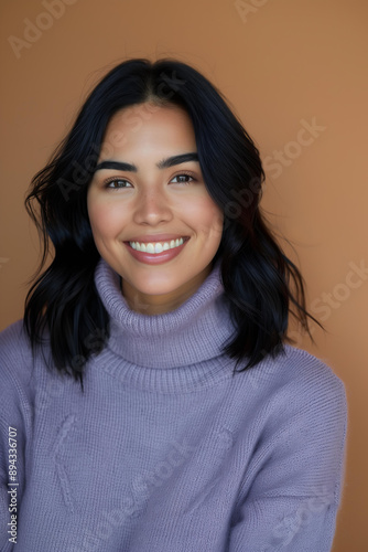 smiling woman with black hair wearing pastel purple turtleneck sweater, brown solid color background