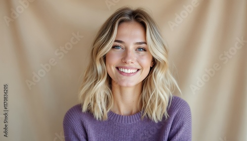 Smiling Woman with Blonde Hair in Purple Sweater: A Warm Portrait