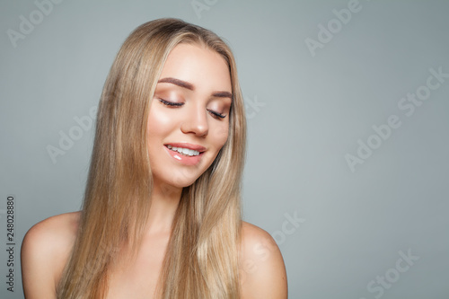 Smiling woman with blonde hairstyle and perfect skin. Facial treatment, haircare, skincare and cosmetology concept
