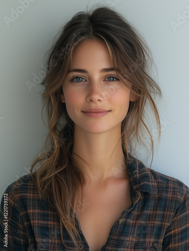 Smiling Woman with Brown Hair: A young woman with long, wavy brown hair and a warm smile, wearing a plaid shirt. Her natural beauty and relaxed expression make for a captivating portrait.