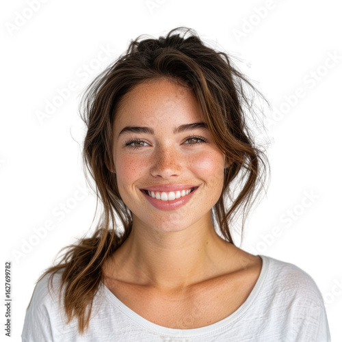 Smiling woman with brown hair and freckles wearing a white shirt against a transparent background. background removed