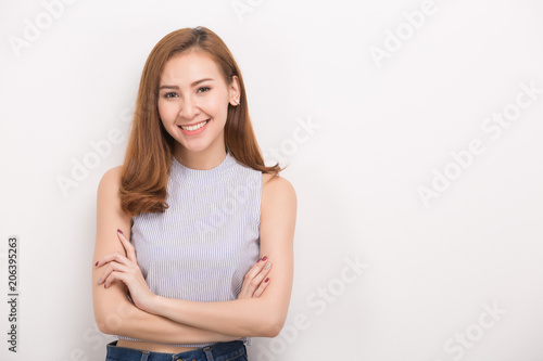 Smiling woman with crossed arms. Portrait isolated on white background.