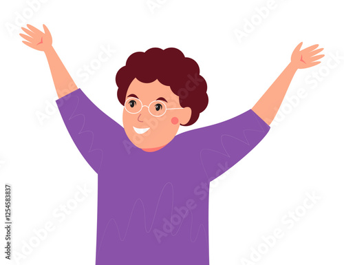 Smiling woman with curly hair wearing glasses and a purple shirt.