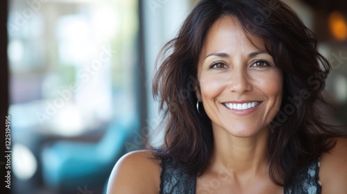 Smiling woman with dark hair indoors showcasing warmth and confidence in a bright, inviting atmosphere