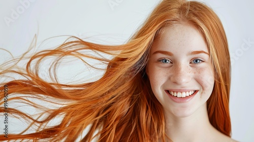 Smiling woman with flowing hair in wind against white background, conveying joy and freedom