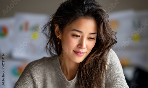 Smiling woman with flowing hair wears a sweater. Behind, papers with colorful graphs