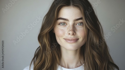 Smiling woman with freckles and long wavy brown hair looking at camera