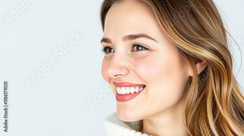 Smiling woman with long hair in a cozy sweater, exuding warmth and confidence against a light background