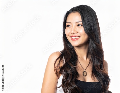 Smiling Woman with Long Hair Wearing Pendant Necklace on White Background