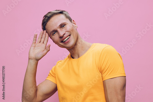Smiling woman with short brown hair wearing a yellow t-shirt and waving hand, looking cheerful and friendly, in front of a pink background. Studio portrait capturing happiness, positivity, and