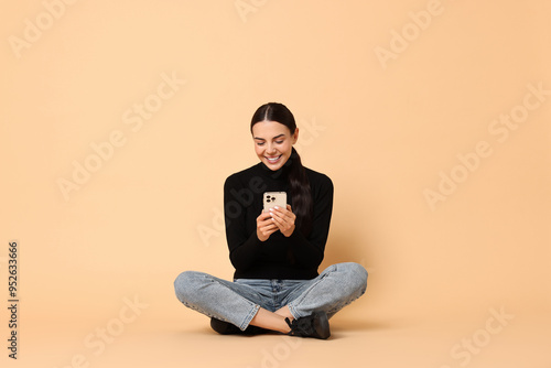 Smiling woman with smartphone on beige background