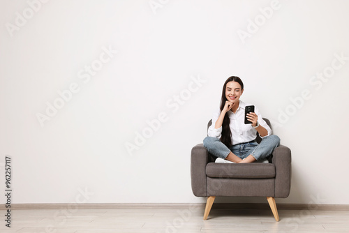 Smiling woman with smartphone sitting on armchair against white wall. Space for text