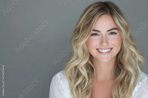 Smiling woman with wavy blonde hair in a light setting posing for a portrait