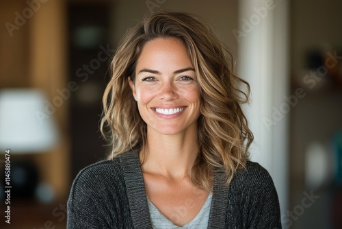 Smiling woman with wavy hair wearing a cozy sweater in a bright indoor setting during daytime